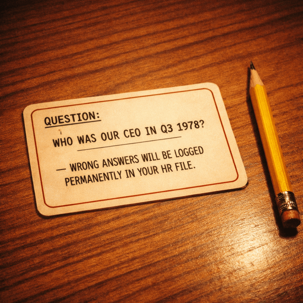 Employees compete in teams answering questions about company history, organizational structure, product details, and executive-level business strategy. All questions and answers are recorded. Employees who answer incorrectly have their names, team assignments, and specific wrong answers logged in the corporate HR system as 'knowledge assessment gaps.' This information becomes part of the employee's permanent record and is accessible to managers during performance planning and promotion discussions.