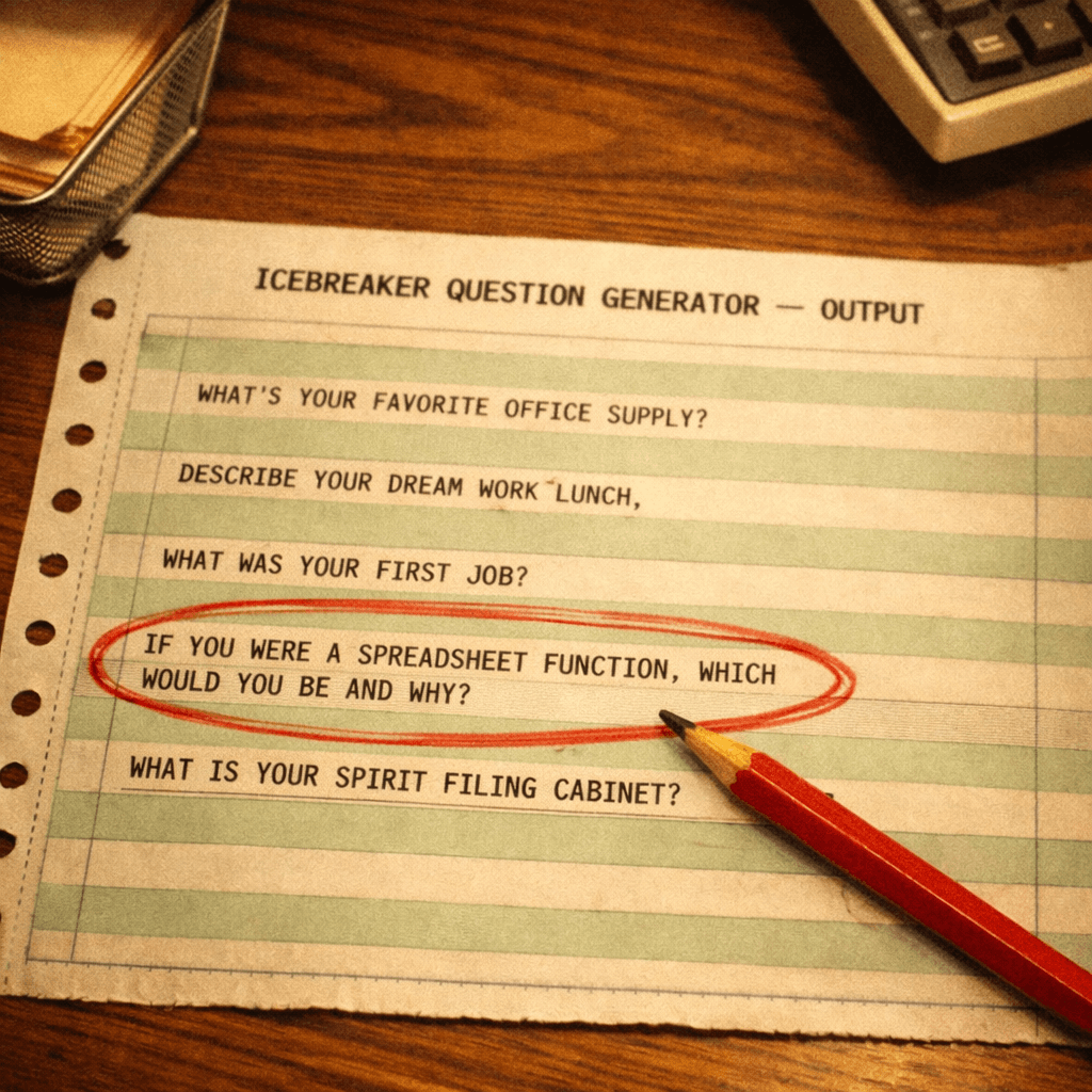 The Icebreaker Question Generator is Gristmill's programmatic approach to forcing interpersonal vulnerability during team meetings and company events. The system generates contextually appropriate icebreaker questions designed to extract personal information while maintaining the appearance of casual team building. Questions are delivered via email, meeting-opening scripts, or dedicated Slack channels.