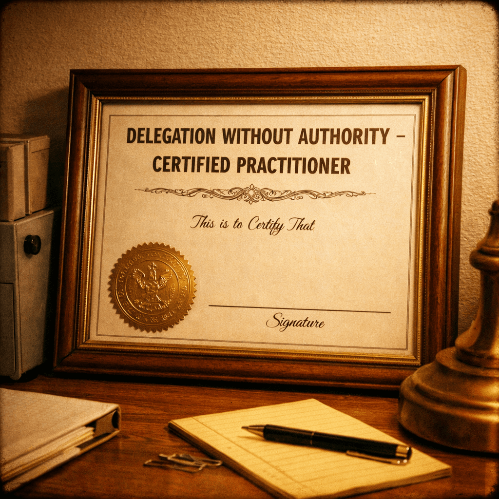 Delegation Without Authority Certification was developed in 1992 by a financial services firm in New York seeking to increase accountability metrics without corresponding increases in operational autonomy. The program teaches managers a specific framework: define clear responsibility, establish measurable outcomes, assign authority for none of the decisions required to achieve those outcomes, and document all accountability pathways.