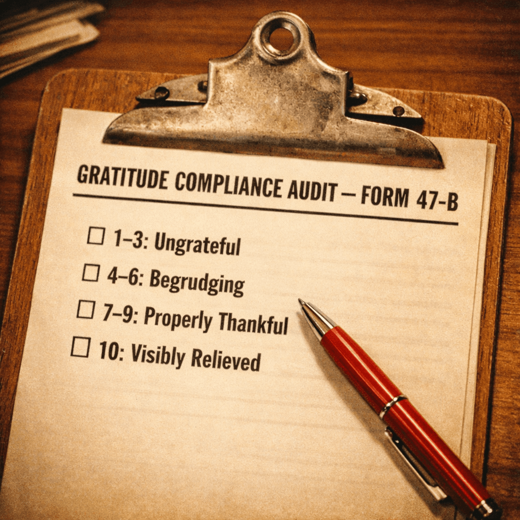 Compliance-Grade Gratitude Audits were formalized in 1995 by a manufacturing firm in Ohio seeking to quantify and track workforce morale in terms that could be integrated into performance review cycles. The audit is a surprise one-on-one interview in which an employee is asked to rate their gratitude toward their employer on a standardized 1–10 scale. The interview is documented in an auditable format and the score is recorded in the employee's personnel file.