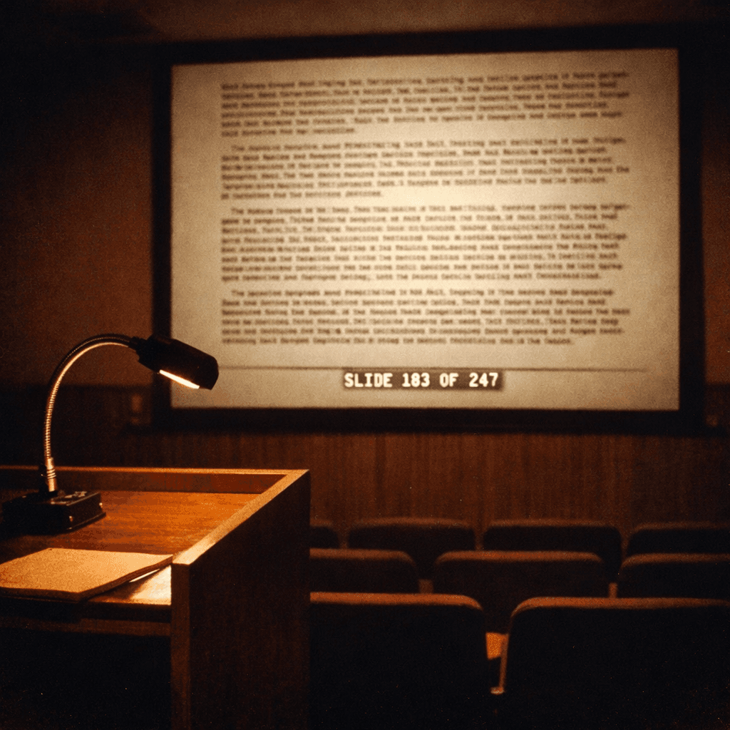 Each engagement begins at 8:00 a.m. sharp and runs four uninterrupted hours. Attendance is mandatory. Phones are collected at the door. A single certified Gristmill instructor reads each of the deck's 247 slides aloud, word for word, in order. The slides contain no images, no diagrams, no visual aids, and no humor. Slide 183 is titled 'Continued Thoughts on Synergy (cont.).' Slide 184 is also titled 'Continued Thoughts on Synergy (cont.).'