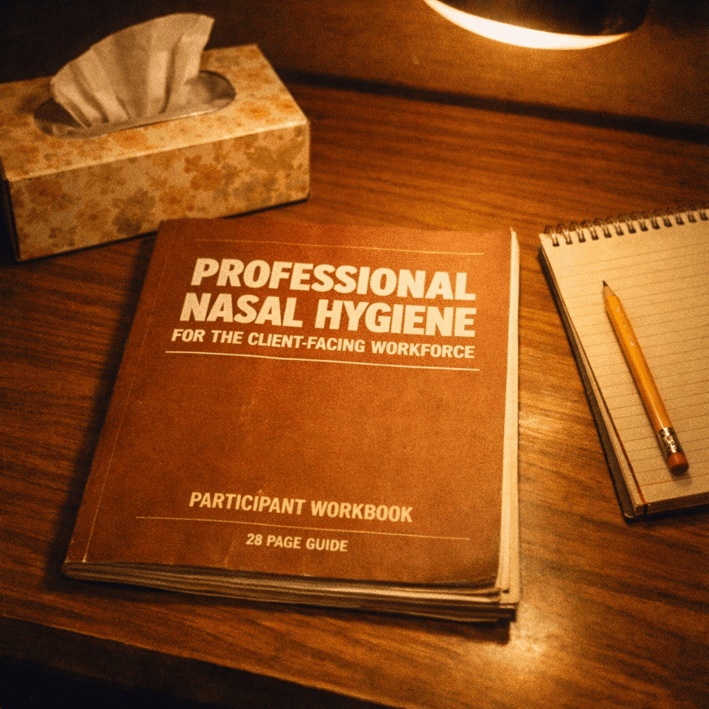 The training presumes no existing hygiene. Topic areas include but are not limited to: tissue grade selection, the two-hand fold, the quiet blow, the after-blow pause, and the three approved stowage locations. Each topic is reinforced by group repetition exercises conducted over video with cameras required on.